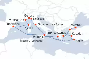 Itinerario : Barcelona, Messina (estrecho), Messine, El Pireo Atenas, Estrecho de Dardanelos, Estambul, Estrecho de Dardanelos, Kusadasi, Mykonos, Katakolon, Messina (estrecho), Sorrento, Civitavecchia - Roma, La Valetta, Kotor, Split, Zadar, Trieste, Dubrovnik, Messina (estrecho), Palermo, Menorca, Barcelona