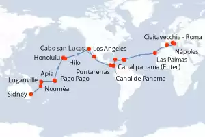 Itinerario : Sidney, Nouméa, Luganville, Pago Pago, Apia, Honolulu, Hilo, Los Angeles, Cabo san Lucas, Puntarenas, Canal panama (Enter), Canal de Panama, Ocho Rios, Road Town, Philipsburg, Las Palmas, Palma de Mallorca, Nápoles, Civitavecchia - Roma