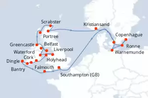 Itinerario : Southampton, Portland, Falmouth, Dingle, Bantry, Cork, Waterford, Holyhead, Liverpool, Dun Laoghaire, Belfast, Douglas, Greencastle, Portree, Scrabster, Invergordon, Kristiansand, Copenhague, Warnemunde, Ronne, Karlskrona, Southampton