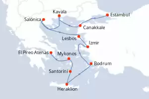 Itinerario : Estambul, Canakkale, Kavala, Salónica, Lesbos, Izmir, Bodrum, Heraklion, Santoríni, Mykonos, El Pireo Atenas
