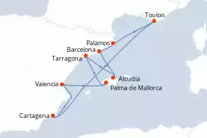 Itinerario : Barcelona, Toulon, Cartagena, Alicante, Valencia, Ibiza, Palma de Mallorca, Alcudia, Palamos