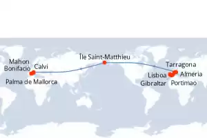 Itinerario : Lisboa, Portimao, Gibraltar, Almeria, Tarragona, Sete, Sanary-sur-mer, Île Saint-Matthieu, Calvi, Bonifacio, Mahon, Palma de Mallorca