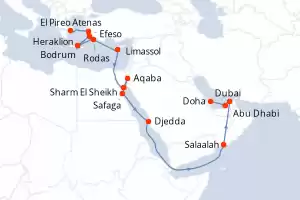 Itinerario : El Pireo Atenas, Efeso, Bodrum, Heraklion, Rodas, Limassol, Aqaba, Sharm El Sheikh, Safaga, Djedda, Salaalah, Dubai, Abu Dhabi, Doha