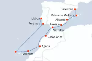 Itinerario : Barcelona, Palma de Mallorca, Alicante, Almeria, Gibraltar, Casablanca, Agadir, Arrecife, Santa Cruz de la Palma, Portimao, Lisboa