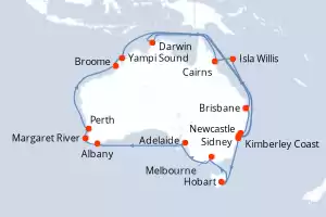 Itinerario : Brisbane, Newcastle, Sidney, Hobart, Melbourne, Adelaide, Albany, Margaret River, Perth, Broome, Yampi Sound, Kimberley Coast, Darwin, Cairns, Isla Willis, Brisbane