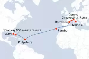 Itinerario : Civitavecchia - Roma, Genova, Marsella, Barcelona, Funchal, Philipsburg, Ocean cay MSC marine reserve, Miami