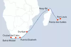 Itinerario : Port Louis, Pointe des Gallets, Nosy-Bé, Durban, Puerto Elizabeth, Bahía Mossel, Ciudad del Cabo