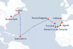 Itinerario : Nueva York, Halifax, Saint John's, Punta Delgada, Funchal, Santa Cruz de Tenerife, Arrecife, Agadir, Casablanca, Lisboa