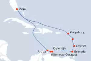 Itinerario : Miami, Aruba, Willemstad(Curaçao), Kralendjik (Bonaire), Grenada, Castries, Pointe a pitre (Guadalupe), Philipsburg, Miami