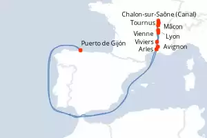 Itinerario : Port of Dijon, Arles, Chalon sur saone (Cana)l, Tournus, Avignon, Tournus, Viviers, Mâcon, Vienne, Lyon, Mâcon, Lyon, Vienne, Tournus, Viviers, Avignon, Chalon sur saone (Cana)l, Arles, Port of Dijon