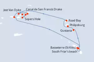 Itinerario : Philipsburg, Road Bay, Jost Van Dyke, Sopers Hole, Canal de San Francis Drake, Norman Island, Spanish Town, Islas Virgenes, South Friar's beach, Basseterre (St Kitts), Gustavia, Philipsburg