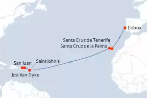 Itinerario : San Juan, Jost Van Dyke, Saint John's, Santa Cruz de la Palma, Santa Cruz de Tenerife, Lisboa, San Juan, Jost Van Dyke, Saint John's, Santa Cruz de la Palma, Santa Cruz de Tenerife, Lisboa