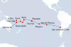 Itinerario : San antonio Chile, Isla de Pascua, Pitcairn, Papeete, Uturoa, Apia, Nukualofa, Suva, Mystery Island, Port Vila, Lifou, Sidney